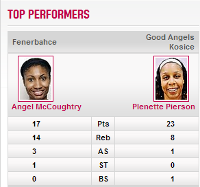 GOOD ANGELS KOSİCE (56): Helena Sverrisdottir 5 (3 asist), Petra Kulichova 10 (13 ribaund- 2 asist), Lucia Kupcikova (1 ribaund, 1 asist), Tijana Krivacevic 6 (1 ribaund, 3 asist), Miljana Bojovic 3 (1 ribaund, 6 asist), Natasha Lacy 4 (7 ribaund, 1 asist), Alexandria Quigley 5 (2 ribaund), Plenette Pierson 23 (8 ribaund- 2 asist)